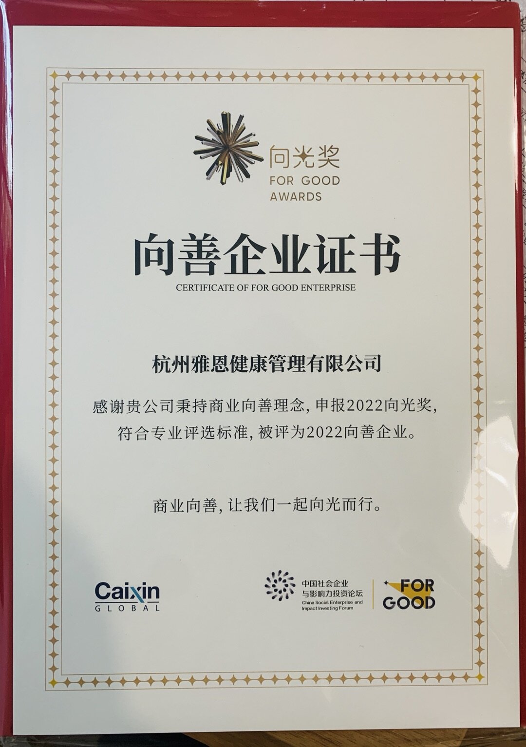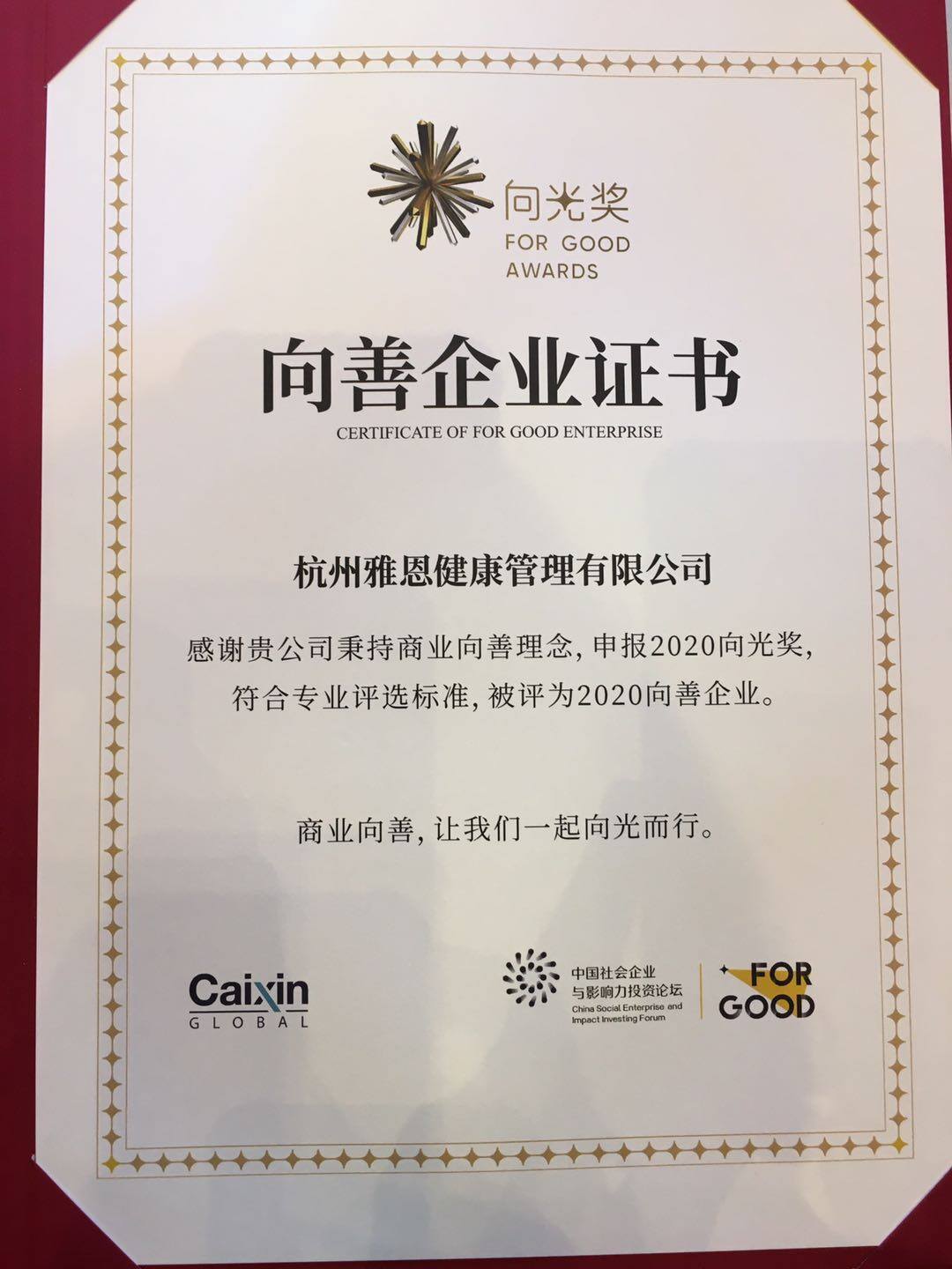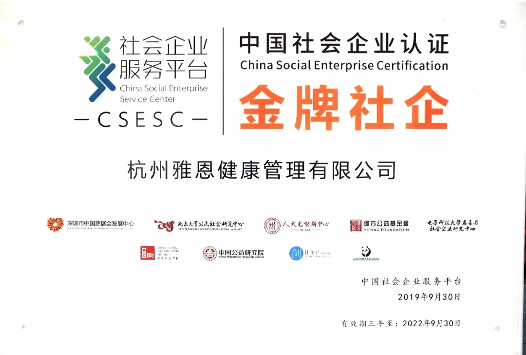 2019年,雅恩健康再度获得中国社会企业认证“金牌社企”称号。