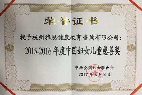 2017年,雅恩健康获得“中国妇女儿童慈善奖”。同年,雅恩上海三家中心获得上海市残联“阳光宝宝卡”定点机构资格。