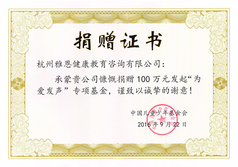 2016年9月,雅恩健康捐赠中国儿童少年基金会100万元,发起“为爱发声”专项基金,为沟通障碍儿童家庭提供公益帮扶。
