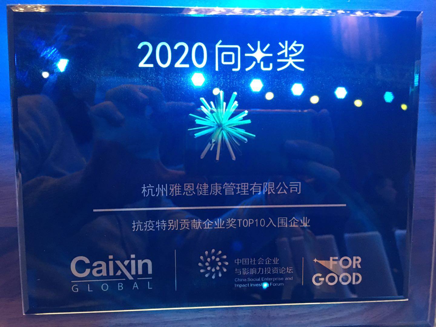2020年,雅恩健康成功入围社企论坛抗疫特别贡献企业奖TOP10,并最终入选2020向光奖“向善企业"名录。