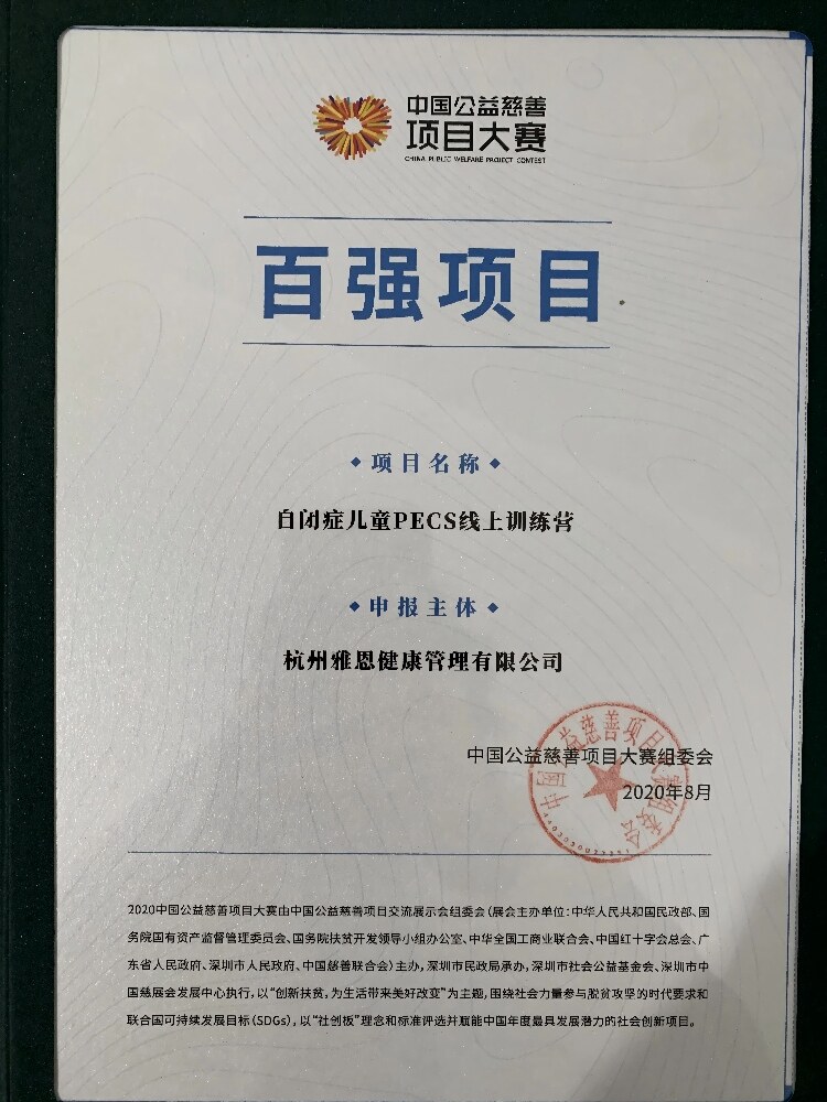 2020年,雅恩健康《自闭症儿童PECS线上训练营》获得中国公益慈善项目大赛百强项目。