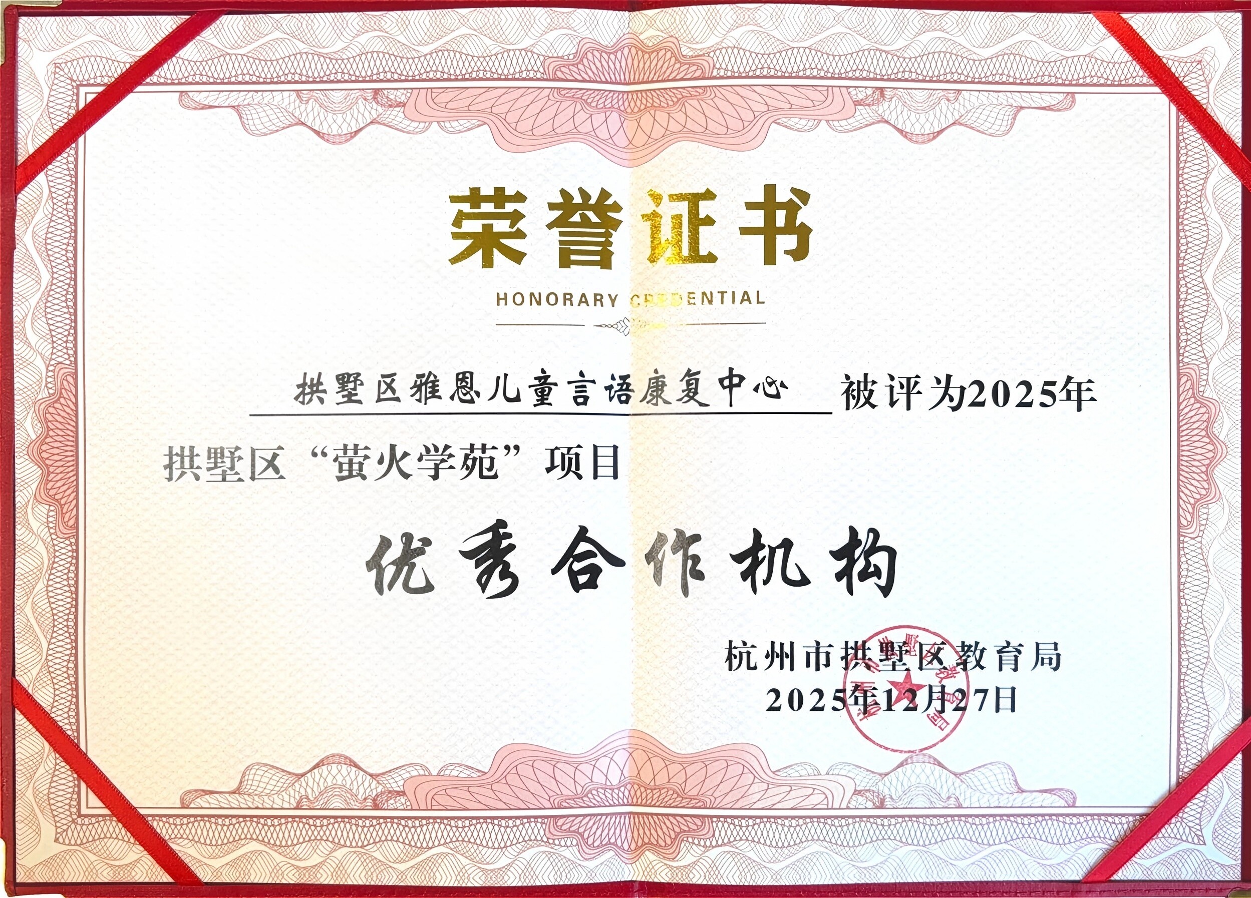 2025年,雅恩儿童言语康复中心荣获年度拱墅区“萤火学苑”项目“优秀合作机构”称号。