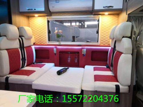 会客区双人对卡座沙发,中间是张手动升降式餐桌,通过降低升降桌,该区域可以变成一张卧床,铺上褥子以后,平整度还是可以的。餐桌上配有电磁炉,在外部天气不好的情况下,可在车做简餐,煮面条,煮饺子,煮火锅都很方便,卡座沙发上方依旧是三个储物柜,下方的外推窗,可以随时欣赏车外美景,顶部配有美的一级变频空调,使用美的空调,可以很快的调节车内温度,而且静音性确实不错。