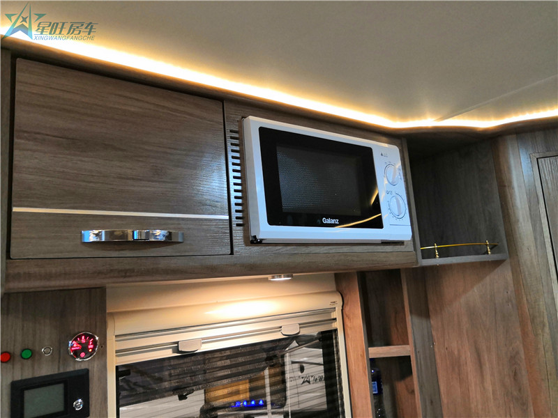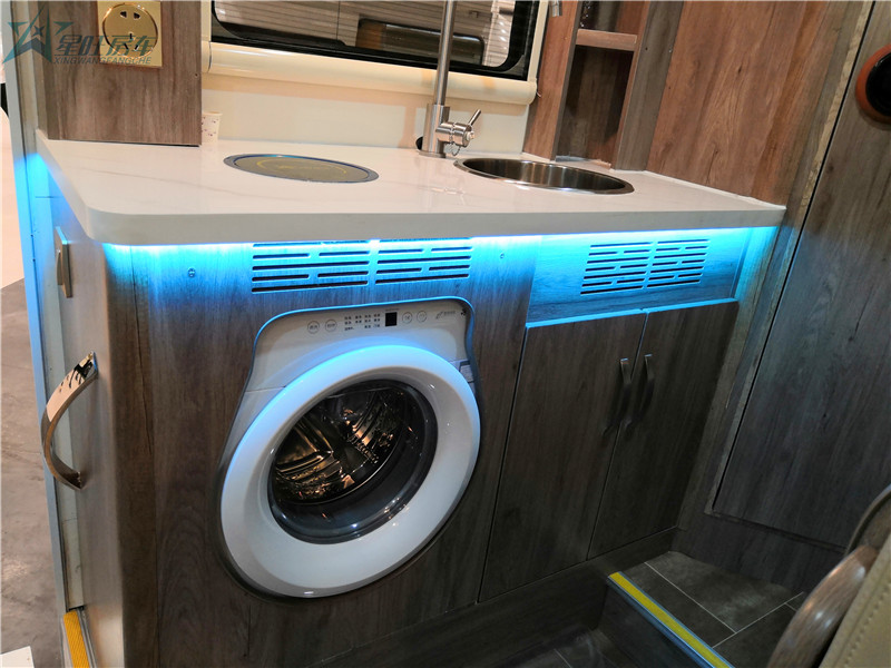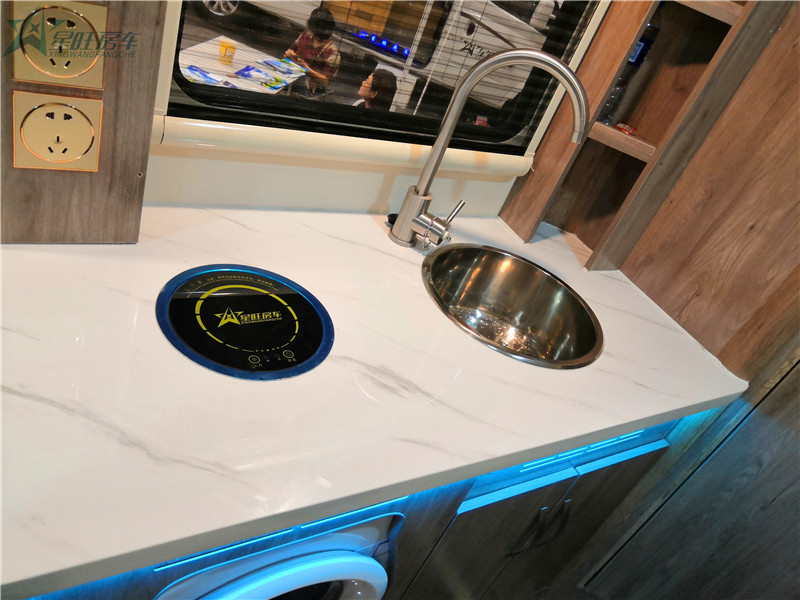 厨房区的上部是做成了橱柜,可以放置一些碗筷以及调料,安装房车专用抽油烟机,即使您在车内烹饪食物也不用担心油烟徘徊在房车里。厨房吧台配备折叠式水龙头的洗菜盆,并有折叠盖,不用水时,把水龙头折叠起来,并把盖放下,是整个灶台显得宽敞许多;洗菜盆为圆型设计,这样不但使洗菜盆的容量变大,还更加美观。电磁炉与灶台相平,是灶台不可缺少的一部分,可以简单的煮粥、煮面、烧水、煮咖啡等等。