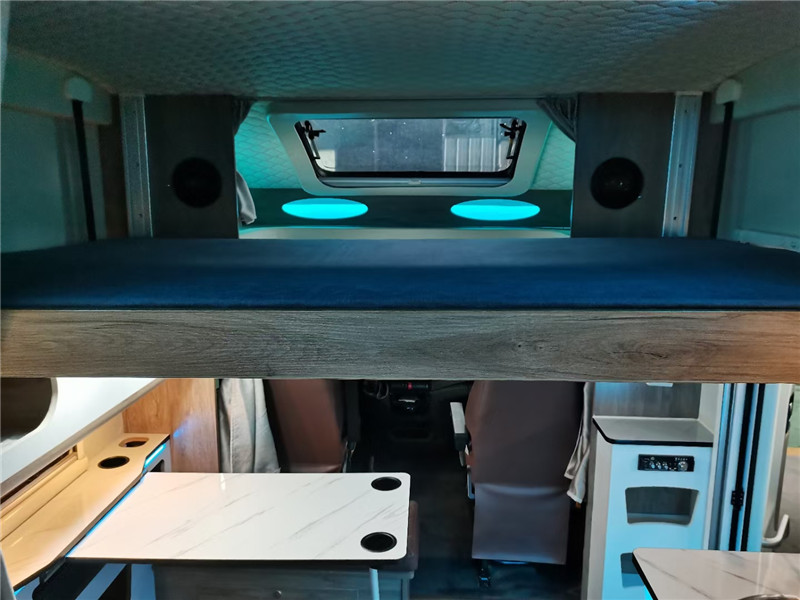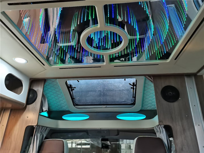 进入车厢内部,整体布局新颖,有科技感,挺有档次的,比较适合年轻人,房车顶部设计成一个开放式空间,但是设计了设计感的灯池,实用性和美观性不错。因为是小额头设计,所以没有安装额头床 ,小额头顶上安装了额头天窗。