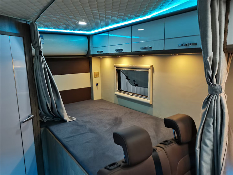 此款依维柯C型自动挡房车卡座的后方是竖置床铺,睡两个成年人没问题,尺寸长1.9米*宽1.3米。床头还有供的USB和五孔插座。整车氛围灯给人以温馨,和谐画面。床上做有隐私帘。