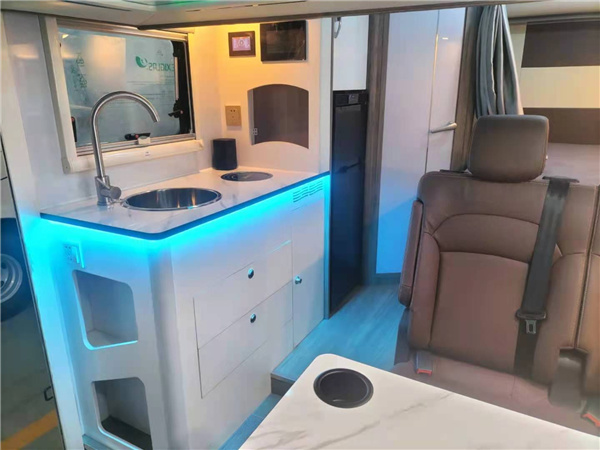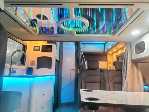 来到车内,首先内室配色就感觉很明快,深浅色的搭配非常和谐。整体布局也很清晰,车厢前半部分为会客区,后半部分为厨房、卫生间与纵置尾床区。很多人一进入车内就说怎么就只有一张床呢,其实不知道会客区域上方隐藏的还有一个电动升降床2000X1200mm,可睡两个大人没问题的,安装小功放音响闲暇时可听听音乐,唱唱歌高歌一曲。