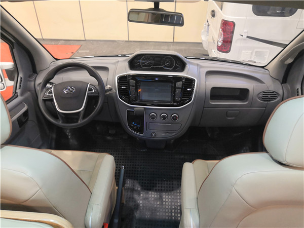 进入驾驶舱,驾驶座采用1 2式布局设计,浅棕色皮质包裹。功能方向盘、大屏导航、倒车可视系统、车身稳定系统、电动可调节后视镜等等。房车内部采用浅色木纹板材,座椅与驾驶座座椅一致,皆是浅棕色皮质包裹,整体风格安静稳重,且又不失温馨的家居氛围。座椅上方空间设计了储物吊柜,储存拿取日常用品都很方便。驾驶室配有19寸折叠网络电视。
