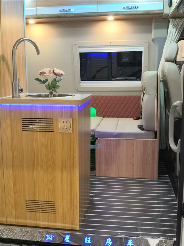 这辆大通V80厨房区域配备了一台800W电磁炉,橱柜上有不锈钢水盆、水龙头等设施,洗菜做饭完全不在话下,一台房车专用的50L冰箱可以让你放心准备旅途中的所有食材,时刻保鲜。