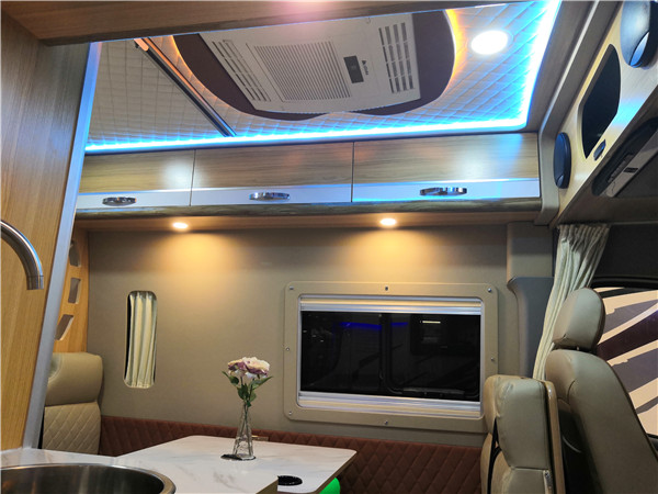 车顶部装有220V顶置空调,手动外推窗,内窗防蚊遮阳设计,即可防蚊又可遮阳。吊柜储物柜组合方便存放日常用品。