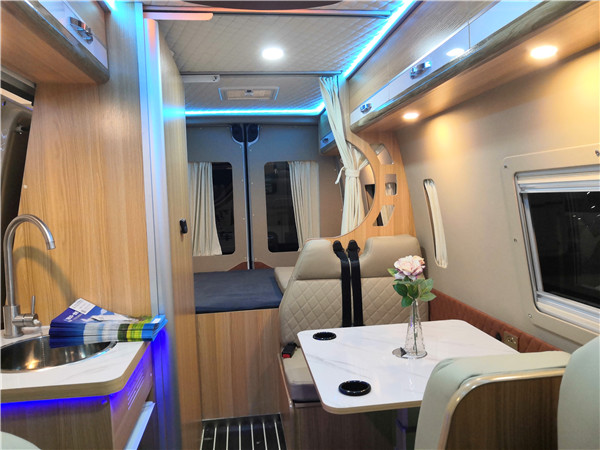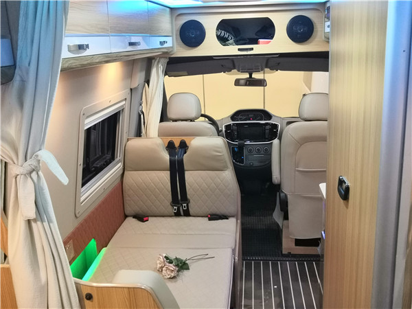 主副驾驶的座椅可360°旋转,加上后排的单人与双人沙发座椅,整个会客区可实现6人同坐,餐桌可自由升降,整个空间由车主自由规划,宽敞不拥挤。沙发座配有两组三点式安全带,靠背较平,长时间靠坐舒适度中等。升降式餐桌降下来可和卡座拼齐变为卡座变床,在车内可以肆意翻腾。