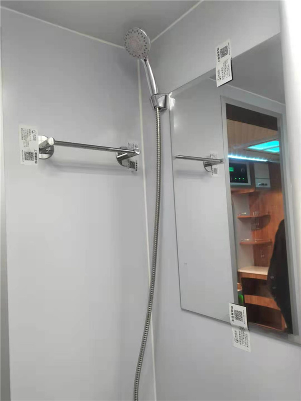 为生间区域配有进口多美达抽拉带旋转式马桶,10L燃气热水器,毛巾架,梳妆镜,淋浴花洒,房车专用换气扇,外推窗,储物盒,方便为日常的清洁打理提供便利。此车电路配有800A锂电,3000W逆变充电一体机,5000W独立柴油暖风,3kg洗衣机,美的家用变频空调,32寸液晶网络电视,用水方面配有300L清水箱,85L 污水箱,黑水箱20L。