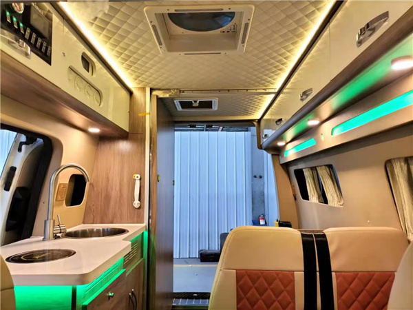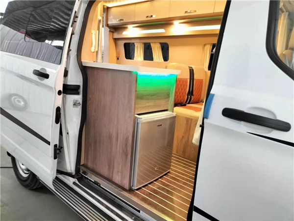 整车尺寸5341x2032x2407mm.轴距3300mm,整备质量3100kg,总质量3510kg,,百公里油耗8.5L满足蓝牌C照驾驶。靠近车门的位置安装了一个立柜,就是标配的车内厨房。房车内部功能区分为驾驶舱、会客区、厨卫区和休息区,布局相对合理,既保留了必要的房车功能又合理分配了车内空间。