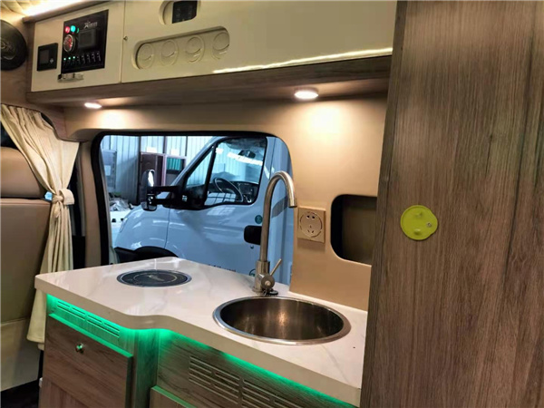 卡座对面就是进门时提到的立柜,上面是大理石饰面的厨房灶台,设置了内嵌式电磁炉+不锈钢水槽+冷热水龙头+车载冰箱,满足了基本的烹饪需求。灶台下面是组合式橱柜,上方的一组吊柜,柜门上做成了水、电控制面板,下面正好是乘客门,操作起来都比较方便。