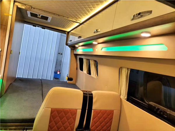 会客区有一个双人卡座+移动式餐桌,都设有安全带,算上驾驶室主副座椅,核载5人。沙发旁边安装了采光窗+隐私帘,可以选装能打开的推拉式通风窗+换气扇等设备卫浴间设计在了车尾,对面就是休息区,为了节省空间设计成了弧形的推拉门,白天不用时就腾出了过道空间。内置的一体式浴室柜,提供了多功能淋浴、洗手两用水龙头+亚克力洗手池+储物柜,配合便携式马桶,实现了基本功能。车尾门打开之后,能更方便的进出休息区。里面是一张可以延伸的大床,行车状态下是1900*900mm,当停车时展开就变成了1900*1100mm的双人床,可以供两名大人同时休息。床铺的左侧和后侧都带有采光窗,可以根据需要选装推拉窗和换气扇,以保证车内外的新鲜空气。