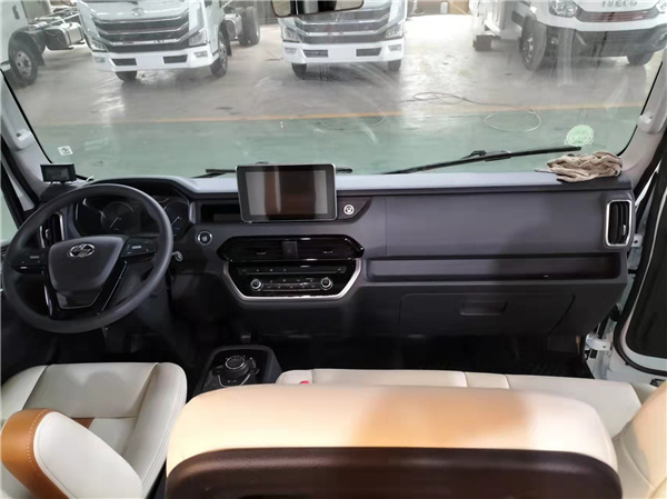 驾驶室中间座椅采用翻折设计,驾驶座位可以乘坐三人,米白加黄棕色的座椅配色精致又上档次。驾驶室配备多功能方向盘、10寸触摸屏+智能语音、液晶仪表、倒车雷达、倒车影像、定速巡航及胎压监测等,后桥速比4.375,挂蓝牌,满足国六排放标准。 中控台上的操控按钮非常少,空调出风口和控制面板借鉴了轿车的设计语言。自动空调和按钮安装在黑色的镜面装饰板上,这个部分也被银色的装饰条包裹起来。速器采用了AMT自动变速器,而控制面板也使用了旋钮+按钮的换挡机构,既节省了车内的空间同样也让内饰质感提高。再就是驻车制动部分采用了电子手刹,考虑到房车都是以舒适性为主的,这些配置有时候的确能给用户带来不错的使用体验。全车均采用了7.50R16的轮胎,配合16寸的六孔钢圈。制动方面标配 ABS防抱死制动,前盘后鼓的制动方式。