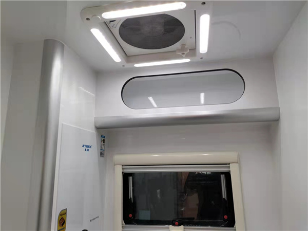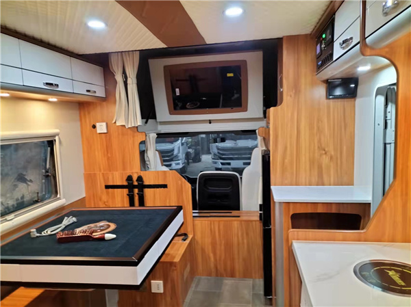驾驶室上方配有额头床2260x1600mm,额头床旁边还设有32寸液晶电视,避免旅途行车无聊。坐在会客区和家人一收看娱乐节目。额头床旁边配有12v133L节能双开门冰箱,冷冻+冷藏,可以满足日常出行带3-5天的食物+蔬菜都是没问题。