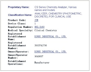 CS系列生化分析仪FDA产品列名 (FDA Listing)
